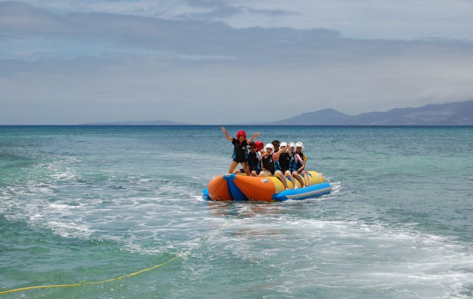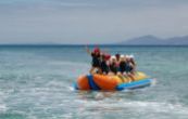 ドラゴンボートは、手すりの付いたボート型の大きな浮き袋にまたがって、マリンジェットで引っ張ります。大きくカーブするとき海に落ちないようにバランスを取るチームワークが試されます。