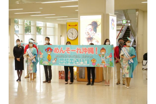 一般財団法人沖縄観光コンベンションビューロー(会長:下地芳郎、以下OCVB)では、緊急事態宣言解除後に再開し始めた修学旅行実施校に対し歓迎の意を表するため、那覇空港にて歓迎式を実施しました。