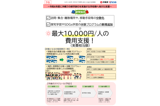 この事業では、令和6年度に沖縄での修学旅行を実施する学校様を対象に、「訪問・集合・離散場所や、移動手段等の分散化」と「探究学習やSDGs学習の体験プログラムの新規追加」の2つの条件を満たす修学旅行について、体験プログラムの新規追加に伴う費用の支援を行います。