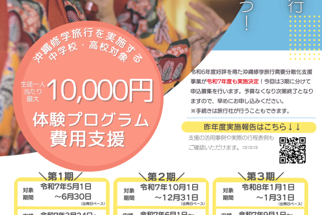 修学旅行需要分散・時期平準化促進事業の第3期につきましてはご好評につき、予算上限額に達したためお申し込み受付を終了いたしました。 ご応募頂き、誠にありがとうございました。申請結果につきましては、審査後メールにてご連絡いた…